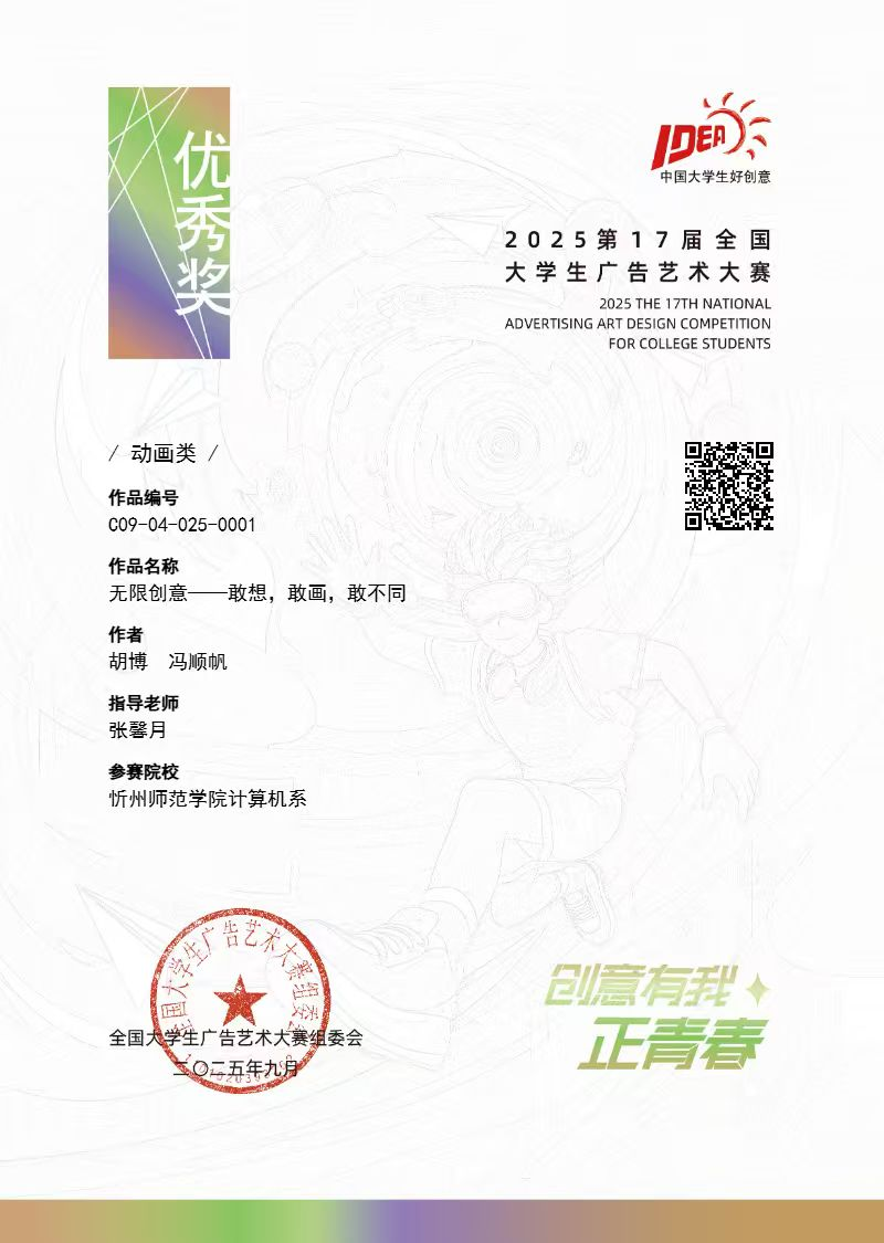 在第十七届全国大学生广告艺术大赛中,作品《无限创意——敢想,敢画,敢不同》(作者:计本2306班胡博、24数媒2班冯顺帆)荣获动画类优秀奖。全国大学生广告艺术大赛是国内规模最大的广告类学科竞赛,动画类作品需兼具艺术表现力与创意深度,此次获奖体现了我校学生在商业动画设计领域的潜力。