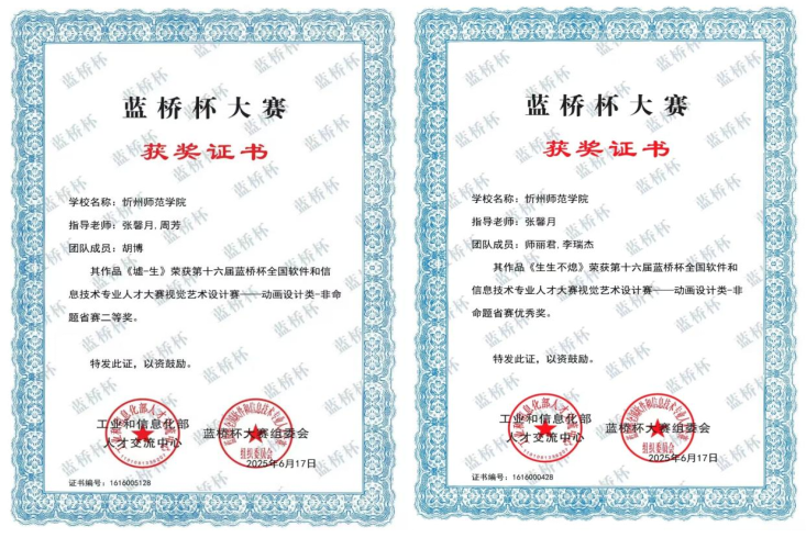 在国家级A类竞赛——第十六届蓝桥杯全国软件和信息技术专业人才大赛视觉艺术设计赛中,作品《墟-生》(作者:计本2306班胡博)荣获动画设计类非命题省赛二等奖;作品《生生不熄》(作者:基本2306班师丽君、李瑞杰)荣获动画设计类非命题省赛优秀奖。蓝桥杯省赛由工业和信息化部人才交流中心主办,是国内极具影响力的学科竞赛,标志着我校学生在动画创意与技术实现上达到了省内优秀水平。
